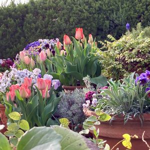 今朝のチューリップ🌷 8:06〜34 ① アベルドンズエリート咲く ② ビオラとタイスブーツ ③ 長持ち!オランダ産チューリップ ④ 富山産チューリップ 紅美人