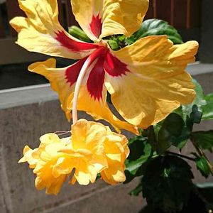 ホーリーモーリー 今日 初めて咲きました。黄色の花びらに、絵の具で書いた様な赤。これから楽しめそう。