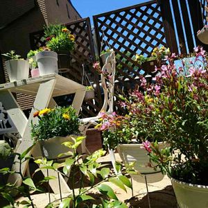 今日もいい天気。 いい色の恵みをありがとう。 DIY応募します。 ラティススタンド付きプランターケース(4つ)はDIYです。 置いてるだけなので、動かすことが可能です。 この場所はもともと駐車場として使う予定でしたが、娘が車を買うまではテラスとして使いたくて、通りからの囲いとして考えて作りました。ラティスそのものは購入品ですが、これに支柱2本を取り付け、プランターケースに差し込んで立てることが出来ます。プランターケースは合板です。プランターの重みがあるので倒れない様になります。ラティスフェンスは風の強い時等は取り外しできます。 白いガーデンテーブルもDIYです。余った材料で作りましたので費用はかかってません。 とにかくお金をかけないでガーデニングすることが自分のモットーです。 このエクステリアデザイン自体(レンガ敷き、門柱まわり、芝生配置等)も自分のスケッチで外構造業社にオーダーしました。