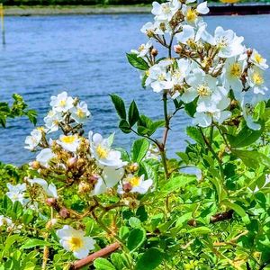 ナニワノイバラ🤍🌿 真っ白な一重の花がステキ〜💠 近所の犬散歩で、たくさんの綺麗なお花が咲いていました(ღˇ◡︎ˇღ)♡︎ʾʾ