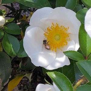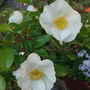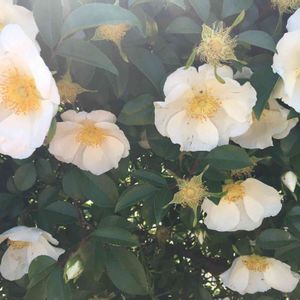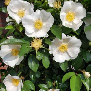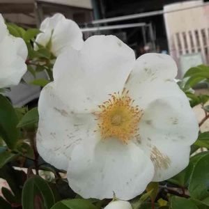 ナニワノイバラです。一重で大きく真っ白で綺麗です。 昨年思いきって短く刈り込みましたがお花が咲いてくれました。
