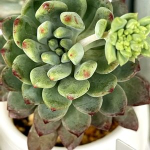 あまり調子が良くなかったブルーアップル🍏 1年前に植え替え だんだんと元気になって子株が沢山😍親株も2つになろうとしています♪ 青白い葉がうっすらと紅葉し始めて綺麗です グリーンローズも肉厚になり少しピンクになった子もちらほら🥰 また可愛い姿を見せてくれる季節がやって来ます