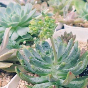ブルーアップルの花芽 クラバツムあたりに似たセダムっぽいお花 ブルーエルフに激似で、ブルーアップルも交配式不明だけど ブルーエルフはセデベリア疑惑有だったような