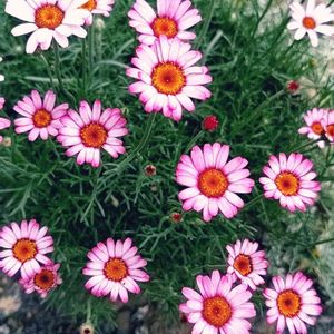 ローダンセマム💕マラケッシュ お花が小さく色濃くなりました まだ蕾があるけれど……… 梅雨前に切り戻したほうがいいということで、そろそろかなー🤔
