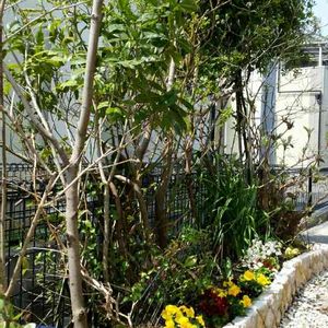裏庭に続く道 モッコウバラとハナミズキが楽しみ♪