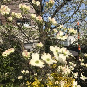 【Garden】 アメリカハナミズキが咲いてる(*゚▽゚)ノ 上の方だけ😅 庭木がモサモサだよ。 良い木蔭が出来て気持ちいいです。
