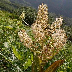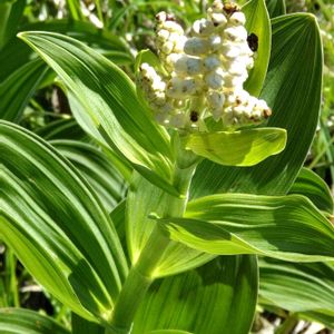 コバイケイソウ(小梅蕙草) *ユリ科シュロソウ属 花期は6〜8月 北海道〜中部地方以北の山地から亜高山の湿原や湿り気のある開けた草地に群生する。 直立して0.5〜1mほどになる。 葉は互生し平行脈が多数ひだ状になる。 花は乳白色で円錐状に多数付ける! ↘️頂枝には両生花を付け緑色の雌しべが目立ちます。 側芽は雄花で結実しない! 数年に一度の当たり年となり 今年はその当たり年のようです! ニッコウキスゲも混じえてキレイな群生でした❣️ 名は バイケイソウに似て小型である事から! 7月25撮影 岩手県 八幡平