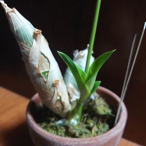 これって…もしかして⁉︎ もしかするかもぉ〜⁉️ 今年5月にお迎えしたモニエララさん 皆さんの花芽投稿をよそにひたすら沈黙🤐 この子だけバルブが立派に育ったのに…と、 意気消沈しておりました⤵︎⤵︎⤵︎ が❣️ こんな狭いところからヒョッコリ〜🎶 花芽だと良いな(〃▽〃)ポッ Monnierara Millennium Magic 'Witchcraft' モニエララ・ミレニアム・マジック 'ウィッチクラフト'
