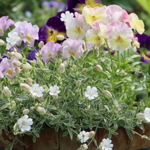 春の寄植え(完成形) 自家採種のパンジー 挿し芽で育てたシレネ・ユニフローラ ようやく咲き揃いました パンジーの柔らかい色とシレネの愛らしい形がよくマッチしています