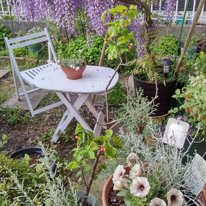 昨日物置の片付けをしてて 出てきたテーブルと椅子に白でペインティングしてみました