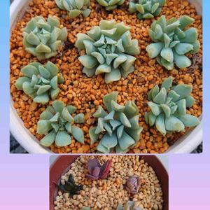 おはようございます。 今日の一枚は多肉ラボ©里親募集にてmiu304さんから頂いた子達です。 募集はパールネックレス(上段)でしたが、おまけに斑入りグリネ(下段右)、エンジェルティアーズ(下段左)も頂きました。 モリモリになってくれると嬉しいな😆
