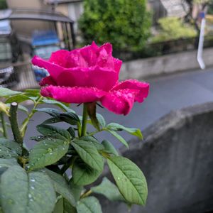 ガレージの上のコスモスのプランターを1つ下ろして、花柄を取りました。外に向かって咲いています。 あると思っていた縁取りピンクは、今は咲いていませんでした。③ 花の根元はこうなっています。 バラ モーリス・ユトリロ、秋は、少しずつ咲きます。