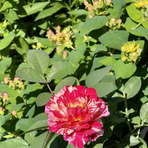 バラ 「モーリス・ユトリロ」 (バラ科) 作出国 フランス🇫🇷 濃赤 白 少々黄色の絞り。四季咲き。 今日の横浜市は朝から雨☔ やっぱり青空の下 綺麗なバラが見たいです🌹 早くやんで〜😆 横浜イングリッシュガーデンにて撮影📷