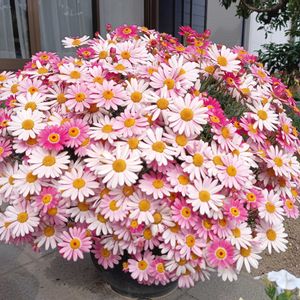 PWマーガレット ストロベリーホイップ 満開間近😍 毎年、早春に鉢増しして10号鉢で株幅60㎝になりました💕 今年は重くて鉢増しできなかったー💦 そろそろ移動も困難に(>_<。) 開花期終わったら挿し穂して、また小さい苗から始めるかな~🤔 昨年もそんなこと言っていたかも🤣