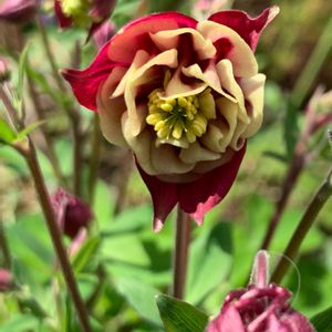 西洋オダマキ ウィンキーダブルレッドホワイト 雨あがりに咲き始めました😊