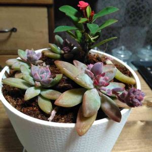 いつもはジュレるのが怖くて部屋の中に入れてたけど思い切って数日外で過ごした多肉さん😃 ピンクに可愛くなってるー❤ 花目もギュッ😍 姫秋麗かな??