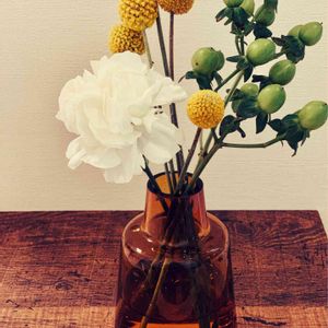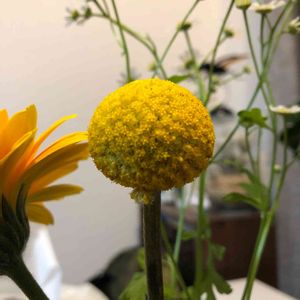 お花の定期便届きました! 今回も大好きなドライフラワーにできそうなお花が入ってて嬉しい。 この黄色いボンボンの名前はグラスペディアというのね。 でもガーベラはやっぱりかわいいなあ。少し元気がないので復活してくれますように。