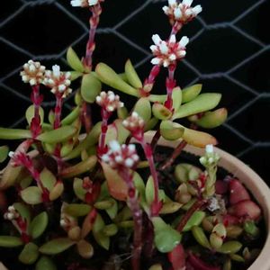 小さい 白い粒々の 蕾なのか花なのかを付けてて可愛い🎶 多肉植物の 紅稚児(クラッスラ属)