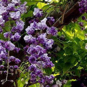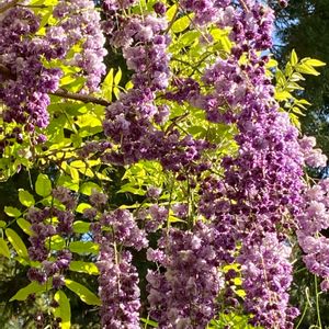 我が家の花畑で、八重黒龍藤がモリモリしてきました‼️ 秘密の花園が、藤の花園になってしまいそうです💜 葡萄🍇の巨峰のようになって、思わず手を伸ばしそう⁉️