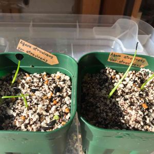2019年11月24日にはアガベの芽が出なかった種は 50℃のお湯に浸けての自然冷却。 したら、残る子達も何割か芽が出ましたo(≧▽≦)o これで、購入した6種全て芽が出ました。楽しみ〜