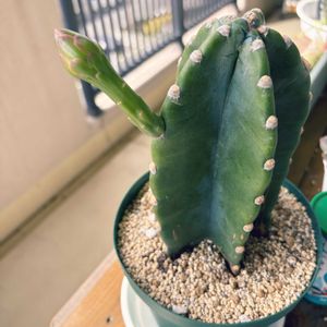 柱サボテン 鬼面角 サボテン科 4年前に投稿した柱サボテンです 全然成長しないので もはや枯れているのかと思っていましたが蕾発見! 「ハ〜イ🖐️枯れてないヨ~♪」って精いっぱい表現しているように見えました🌵🎶 4年前に投稿した時と同じ埴輪も一緒に撮りました🤳🌵 水やり 肥料 日照不足 置き場 害虫などの原因が考えられるみたいです まずは花が咲き終わったら 一回り大きな鉢に植え替えてみます