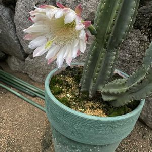 柱サボテン9本を頂いたので、鉢植えにしました! 1週間干してる間になんと、咲きました!切った後に咲くなんて、驚き。