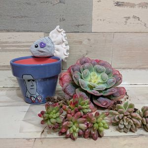 🙇売り切れました🙇 販売用です🎶No.15 えつこさんのリメ鉢2.5号鉢🗿 ウテキ(コブエケ) 虹の玉 ミニ苗 2個 ジョイスタロック錦 ミニ苗 2個 まつぴよさんが、保護猫募金の為に作ってくれました。 お魚ちゃん 第4種郵便速達にて発送予定です。 梱包後に送料込の金額を連絡させて頂きますね。 リメ鉢は、防水加工はしていますが、雨ざらしにはしないで下さいね。 水曜日の発送になります。 宜しくお願いします🙇