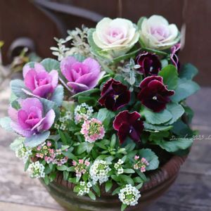 先週作った寄せ植え 何か物足りなくてそのままキープ 今日 葉牡丹の後ろに グリーン足しました(*´ω`*) うん 落ち着いたかも♫ 小輪パンジー わらく プチグレース スプレー葉牡丹 デュエット アリッサム レモン&ピーチ コプロスマ キルキー