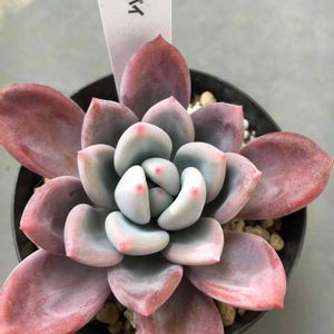 謎多肉ドゥバイ ノペーっとした感じから少しずつ脱出中✨ 下の子☺️ アメジスチヌムだと思ってたけど、微妙に違うんじゃないかと思い始めた💧 マダラ~アメジスチヌム(仮)