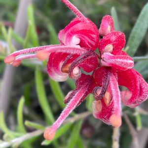 ご近所は世代交代が進み、若いご家庭の花壇は、私にとって新鮮なお花が多く出会いが楽しみです💕 グレビレア 鮮やかな色の花と、小ぶりの緑の葉とのコントラストが美しい❣️ 🏷真っ赤な火曜日 🏷あっ火曜日 グレビレアの花は、雌蕊が主体 種になる部分から複数の雌蕊が飛び出しくるりと巻き、ユニークな花姿に💕 ヤマモガシ科/グレビレア属 原産;オーストラリア 常緑低木 花言葉;情熱、あなたを待っています