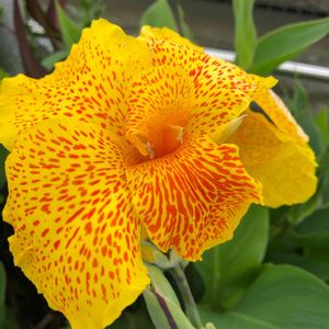 おはようございます☔️ ご近所の川沿いの花壇で、久しぶりの カンナです。🌼 激しい雨☔️早くおさまってほしいです。