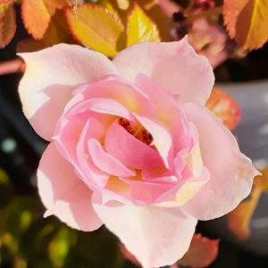 🩷ミニバラ 冬色の葉っぱの中に ピンクのミニバラ一輪 可愛いく咲いています 𓂂𖡼.𖤣𖥧𓈒◌🩷🌿܀𖥧𖧧 ˒˒.