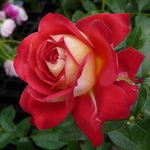 花びらの表は綺麗な赤と言うより朱色に近い赤色、裏は黄色の素敵なバラです(^^)