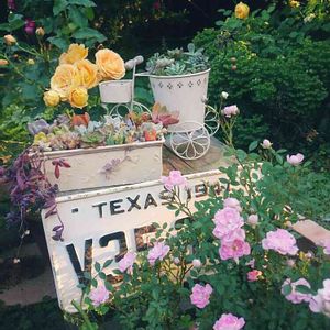 多肉の寄せ植えとバラ🌸 ピンクのバラは宇部小町 黄色のバラはラ・ドルチェビータ 5月中旬のpic