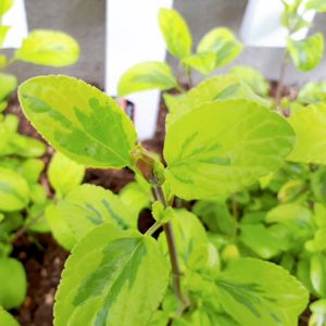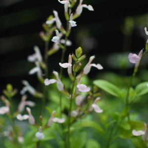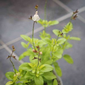 チェリーセージ ムーンライトオーバー きれいなライム色の斑入りに淡いアプリコット色のお花です