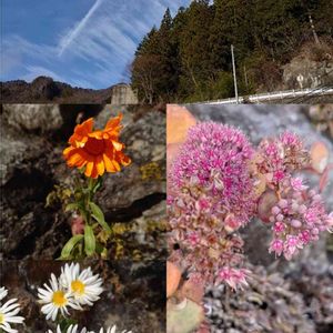 12/20㈰③ 行く途中で出会った花たちと、飛行機雲 小さなオレンジ色のジニア 白い野菊は花は咲いてましたが葉がチリチリに丸まって枯れていました。 ピンクはオオベンケイソウかな? 違っていたら教えてください。