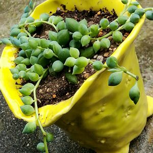 お豆さん、遅くなりました🍀 HTCのプレゼント企画で当選した お豆さんの手作り鉢に⤴💓 花壇や庭木と 可愛いものが無くて 鉢植えは、 お世話が無頓着で💧 やっと見つけた ピーチネックレスを植えてみました💛 如何なものでしょうか⤴(ノ_・。) ※幸せの黄色い鉢で、これから笑顔の日々を過ごします(*^_^*)
