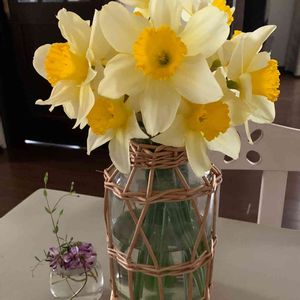 昨日の夕方、庭にたくさん咲いている水仙をカットしてきました✂️ これで20本🎶 花が重なっている箇所のものを適当にカットしてきただけですが、程よく長さにばらつきがあり、ただ差しただけでこんなにキレイ✨ 全方向に元気を振りまいています(笑) こうして近くに置くと、かすかな香りに気づいたり😊 今日は思いの外早くから雨が降ってきてしまったので、いいタイミングでのカットでした✌️ 一緒に飾った小瓶には、子どもたちが摘んできたレンゲたち💕 春ですね🌸🤗🌸