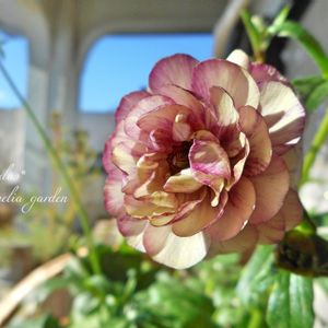 ラナンキュラス ラックス 「アイオリア」 . あまりにも南風が強くて、暴れっぷりがすごいアイオリアさまは折れてしまいそうなので、ただいま玄関内に避難中です🤣 過保護でございます… 一年目にしてはすごい咲きっぷり。 来年が楽しみではありますが、来年はどんだけ暴れるのか不安…🤣