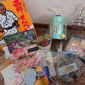 オフ会で頂いたお土産と抽選会景品(3個)です(❁´3`❁) ♡ (寄せ植えの中のブラウンローズ🌹) 可愛い宝物がいっぱい😍💕