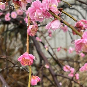 今日のお花 「モモ」 写真は枝垂れ桃です お詫び コメントをいただき 枝垂れ梅の間違いのようです もうし訳ありませんでした🙇♀️ 2月22日撮影 みぞれが降る中綺麗に咲いていました ※バラ科サクラ属