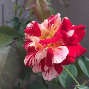おはようございます。 薔薇🌹ジョージバーンズです。 咲いた時は黄色と赤の模様ですが3、4日経てば違う薔薇のように変わります🎶