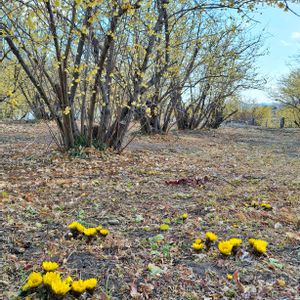 福寿草が2輪咲いてました💛💛 節分の日には既に咲いていたのね💗🎶 ふと見ると、隣にダイコンソウが👀💜✨ 正式名称何だったかしら💦 ロウバイの花も満開です🟡🟡🟡🟡🟡🟡🟡日に当たっているところは内側が紅いのね(*^^*)