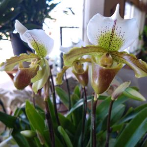 Paph. venustum x sibling ('Wild Cat'x'Terry Fox') 2輪目開花もpostします 同じ方を向くように 矯正しようとしたけど やっぱりムリ… はっきり好き嫌いの分かれるパフィオ 私は好🥰