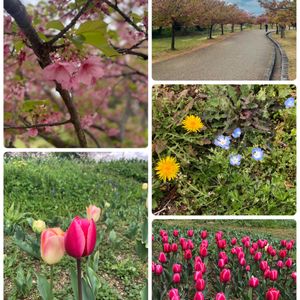 春を探しに。 義理父母と、お出かけ🚶🚶♀️ 河津桜の並木道。綺麗でした🌸 仲良しチューリップ🌷に、こちらが照れる🥰 たんぽぽに、ネモフィラ。 ようこそ春へ☺️