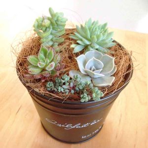 ビニールポットに入りっぱなしだった子たちを寄せ植えしました。 多肉ちゃんを植えるよりもヤシの繊維を敷くのに一苦労……(;ー◞౪◟ー)