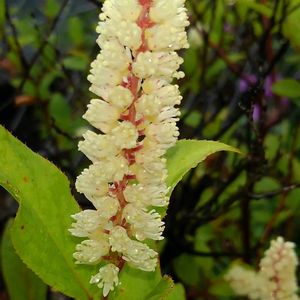 ブラシのような コバノズイナの花序が たくさんぶら下がり 花を咲かせ始めました♪ その下には ヤマアジサイやアスチルベ