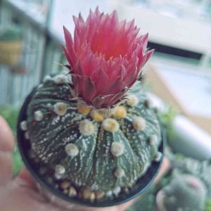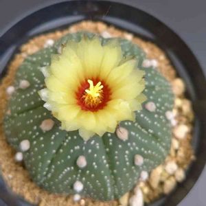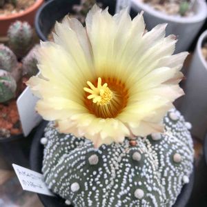 astrophytumasterias アストロフィツム大疣兜丸 屋内に避難させてた兜の終わりかけの花がライトに透けて綺麗だったので📸 サボテンはどれも花が魅力的なのもハマった理由のひとつです👌