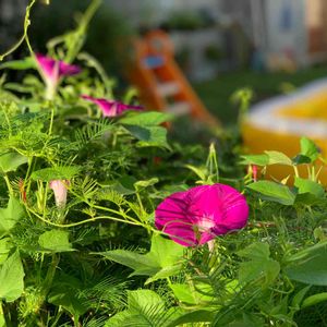 朝顔はちょっと時間が経つと花が傷んでしまいますね。お隣さんはプールを出して夏休み感いっぱい😊ルコウソウはお隣さんが植えたもの。もっと花が増えるといいなぁ
