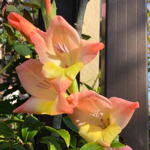 今朝の庭で…花友さんからのグラジオラスが素敵です💛🧡🎶 この色がとっても気に入りました💓💓 立派な球根だから、11月なんて無理よ!待ってられない!!😝と言われてるよう😆 ゆっくり咲かすには涼しい方が🤔いやいや咲かないと困るからね! 心配で日当たりの良いとこ✌️と思いプランターに植えてます。 同じの2つ🧡🧡 買ったもの1つは痩せてたから咲けるかな〜💜😂
